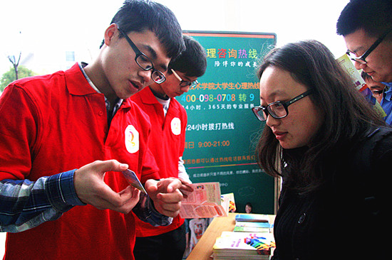 春季已至,阳光正好。2014年3月17日中午12点,由大学生心理健康教育中心主办,校心理协会(简称心协)承办的“24小时心理咨询热线”现场宣传活动在第一和第二食堂前顺利举行。心协的工作人员采用一对一的形式向同学们介绍24小时心理咨询热线的功能与特点,详细讲解心灵成长关爱卡的作用与使用方法。在心协工作人员的建议下,同学们认真地将热线电话号码保存在手机中,方便在需要的时候能够及时拨打,寻求心理支持。此外,心协还向同学们分发印有24小时心理咨询热线电话号码的宣传册和书签,方便那些没有时间驻足倾听的同学获得相关信息。