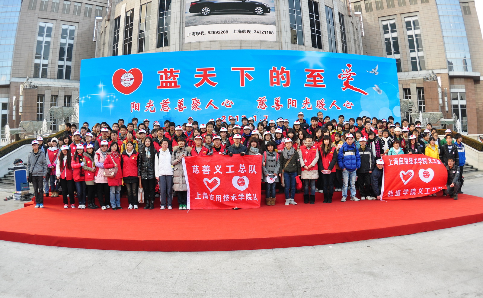 1月8日,今年第18届“蓝天下的至爱――爱心全天大放送”活动在申城掀起了一股爱心帮困的热潮。为了让上海市的2万户特困家庭过好春节,为了进一步弘扬义工无偿奉献精神,展示大学生和慈善义工风采,我校16个学院270名慈善义工队学生积极响应活动招募并主要承担了徐家汇商圈的上街慈善募捐活动。